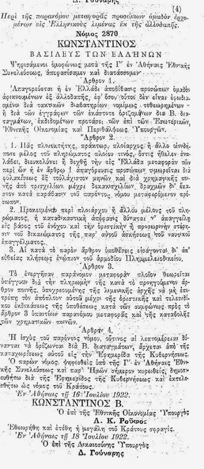 Τον Ιούλιο του 1922 η μοναρχική ελληνική κυβέρνηση αποφασίζει να απαγορεύσει στον ελληνικό πληθυσμό να εγκαταλείψει τη Μικρά Ασία. Η απόφαση αυτή πήρε τη μορφή του Νόμου 2870/1922, ο οποίος προέβλεπε αυστηρές πειθαρχικές και χρηματικές ποινές, στην περίπτωση σύλληψης πλοίων που θα μετέφεραν πληθυσμό. Ο Νόμος 2870/1922 ψηφίστηκε τον Ιούλιο, λίγο πριν την κατάρρευση του μετώπου.