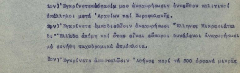 Στη συνέχεια έκανε κάποιες προτάσεις. Μία από αυτές ήταν: «Εγκρίνετε εμποδισθώσι αναχωρίσωσι Έλληνες Μικρασιάται δι’ Ελλάδα, ακόμα και όταν είναι εύποροι δυνάμενοι αναχωρήσωσι με συνήθη ταχυδρομικά ατμόπλοια». Η κυβέρνηση υιοθέτησε αυτές τις προτάσεις και τις μετέτρεψε σε τελική κυβερνητική επιλογή.