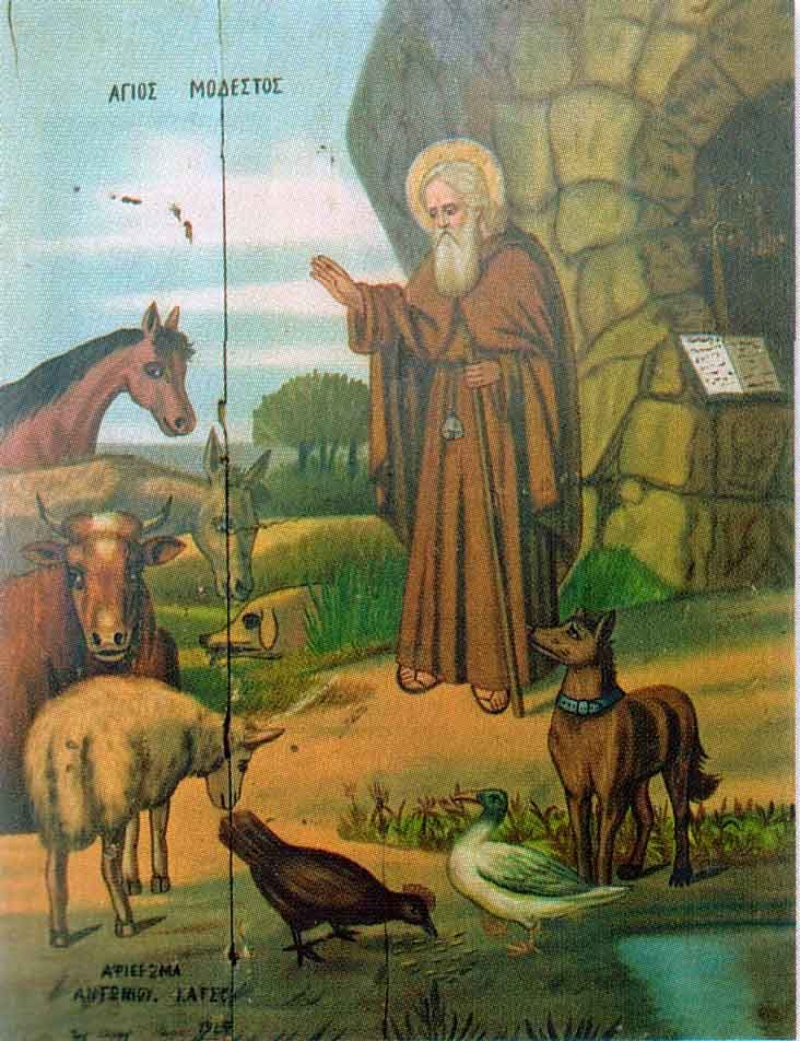 Ο Άγιος Μόδεστος θεωρείται από την Εκκλησία μας προστάτης των ζώων και τιμούμε την μνήμη του στις 16 Δεκεμβρίου. Την ημέρα αυτή συνηθίζουν οι χριστιανοί να ραντίζουν με αγιασμό τα σπίτια τους, αλλά και τα ζώα τους και τους στάβλους των ζώων. Ιδιαίτερα φέρεται να προστατεύει τα ζώα που σέρνουν άροτρο και τα οικόσιτα ζώα.