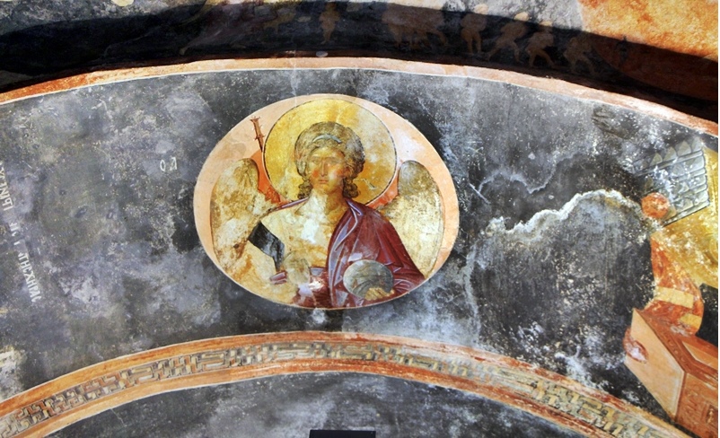Αναφορικά με τις τοιχογραφίες, στις οποίες ξεχωρίζει η σύνθεση της «Εις Άδου Καθόδου», ο Delvoye παρατηρεί: «Στον τρούλο, η προτομή της Θεοτόκου με το βρέφος περιβάλλεται από τους δώδεκα αγγέλους του Κυρίου. Στα σφαιρικά τρίγωνα, οι τέσσερις ευαγγελιστές, που συναντάμε στη βάση των τρούλων με τον Παντοκράτορα, έχουν αντικατασταθεί από τέσσερις ποιητές – υμνογράφους της Παναγίας: τον Ιωάννη Δαμασκηνό, τον Κοσμά, … τον Ιωσήφ … και τον Θεοφάνη. Οι λόγοι που προσδιόρισαν την εκλογή των θεμάτων και τη σαφή αναφορά στους υμνογράφους φανερώνουν ότι ο δημιουργός του προγράμματος είχε μια εκτεταμένη γνώση της εκκλησιαστικής λογοτεχνίας».