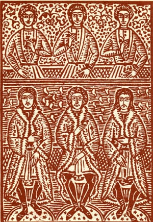 Ο γέροντας έκανε ένα νεύμα στα παλικάρια κι εκείνα βγήκαν από το δωμάτιο κι ύστερα από λίγο γύρισαν κρατώντας ένα δεμάτι ξύλα και ένα βελούδινο πουγγί.