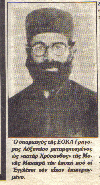 Το Πάσχα του 1956, βρίσκει τον ήρωα ν’ αναρρώνει στην ιστορική ιερά Μονή Μαχαιρά (1148 μ.Χ.), στο όρος Τροόδος, μετά από μια ιατρική επέμβαση. Εκεί, πάνω από εκατό Άγγλοι αξιωματικοί και στρατιώτες έζωσαν το μοναστήρι, ενώ εκείνος με απόλυτη ψυχραιμία εμφανίστηκε ενώπιόν τους, μεταμφιεσμένος σε μοναχό, με γενειάδα και ράσο, ως ο «πάτερ-Xρύσανθος», και μάλιστα προσέφερε στους βρετανούς και το καθιερωμένο κέρασμα που παρέθετε η Μονή στους επισκέπτες, χωρίς κανένας να τον αναγνωρίσει! Τον Ιούλιο του 1956 προστέθηκαν στον τομέα του και τα κρασοχώρια Λεμεσού. Έδρασε με τα ψευδώνυμα Ζήδρος, Αίας, Άρης, Ρήγας, Ζώτος, Ανταίος και έγινε το φόβητρο των Άγγλων και ο θρύλος των συμπατριωτών του.
