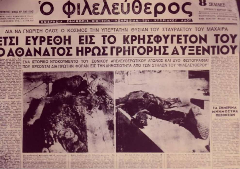 Το απανθρακωμένο σώμα του Γρηγόρη Αυξεντίου και δημοσίευμα Εφημερίδας της εποχής για το ολοκαύτωμά του (cyprusalive.com, onalert.gr)