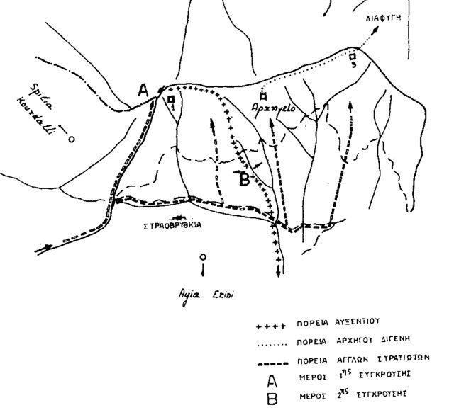 α. Τα Σπήλια την εποχή της ιστορικής μάχης, β. Σχεδιάγραμμα της μάχης στα Σπήλια, γ. Ο Γρίβας Διγενής με μέλη της ομάδας του, δ. Ο ήρωας των Σπηλίων, Γρηγόρης Αυξεντίου (ikohouse.wordpress.com, pinterest)