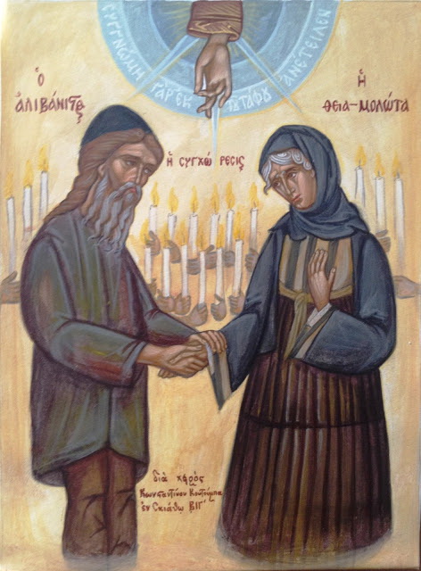 Ἡ Μολώτα ἠκολούθησε κατὰ γράμμα τὴν συμβουλὴν τῆς Ἀφέντρας. Εἰσῆλθεν εἰς τὸν ναόν, ἠσπάσθη τὸ Εὐαγγέλιον καὶ τὴν Ἀνάστασιν, εἶτα ἐζήτησε συγχώρησιν ἀπὸ τὸν Κόλιαν. Ἀκολούθως, τὴν ὥραν τοῦ Κοινωνικοῦ, ἐπλησίασε μαζὶ μὲ τὰς ἄλλας γυναῖκας εἰς τὴν βορείαν πύλην τοῦ ἱεροῦ, ὅπου ὁ ἱερεὺς ἀνέγνωσεν ἐπὶ τῶν κεφαλῶν των τὴν συγχωρητικὴν εὐχήν, ἐνῷ ὁ μικρὸς ψάλτης ἐμινύριζε τὸ «Σῶμα Χριστοῦ μεταλάβετε».