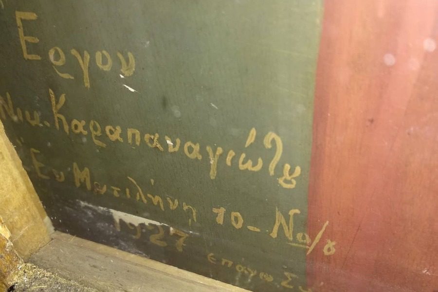 Από την εικόνα της Αγίας Ειρήνης στην Παλαιά Φώκαια Αττικής που ιστορήθηκε στη Μυτιλήνη μετά τη Μικρασιατική καταστροφή. Σε αυτήν διαβάζει κανείς: «Έργον Νικ. Καραπαναγιώτου Εν Μυτιλήνη 10 Ν/ου (σ.σ Νοεμβρίου) 1927 Επάνω Σκάλα»