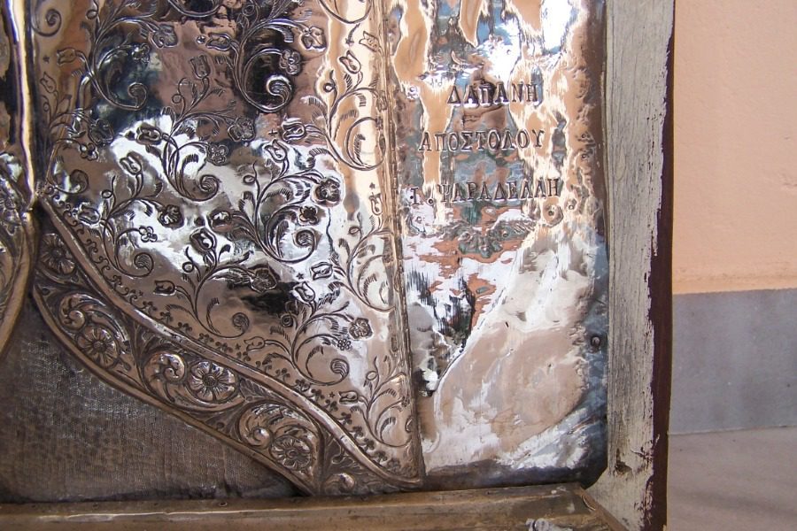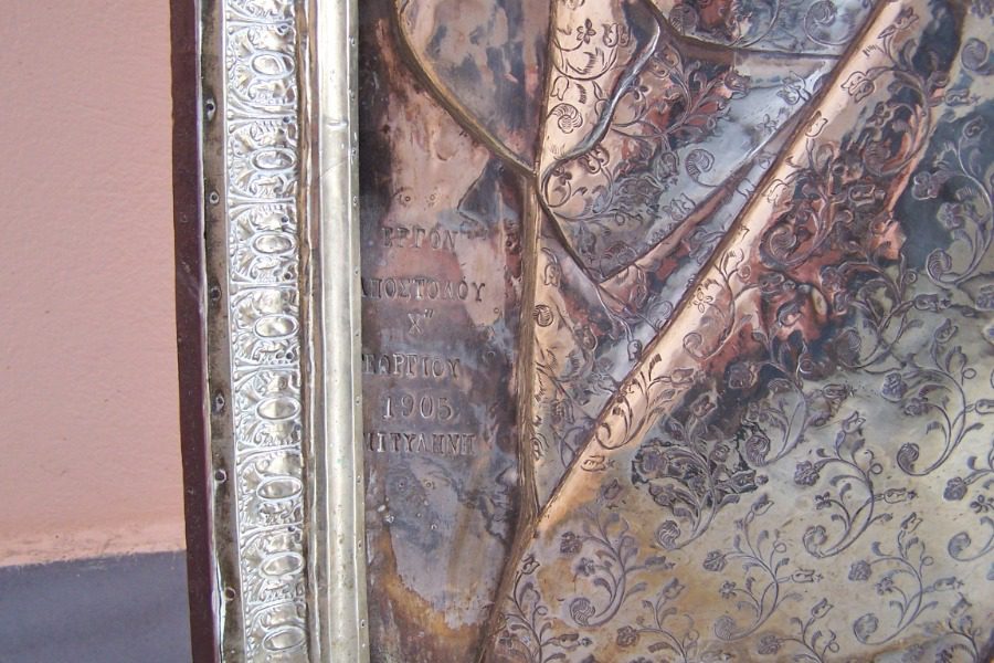 Από το «πουκάμισο» της εικόνας της Αγίας Ειρήνης στο παρεκκλήσι της Μυτιλήνης. Αναφορά στον κατασκευαστή και στον δωρητή