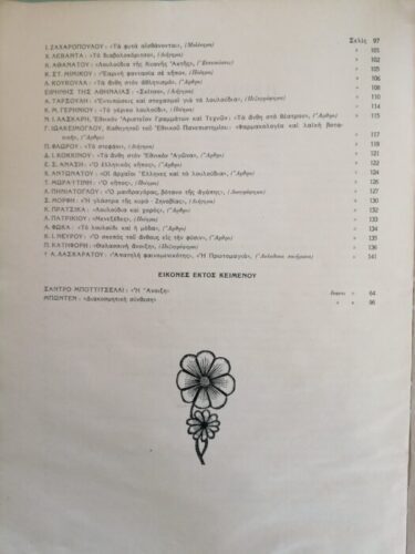 Στις σελίδες του, δημοσιεύονταν ποικίλες συνεργασίες, με θέμα τα λουλούδια. Όλες ήταν πρωτότυπες και αξιόλογες. Συντάκτες τους ήταν γνωστά ονόματα της εποχής. Πιο συγκεκριμένα, περιλαμβάνονταν: ποιήματα (Κωστής Παλαμάς, Μιλτιάδης Μαλακάσης, Απόστολος Μελαχρινός, Στράτης Μυριβήλης, Άγγελος Σημηριώτης, Ρήγας Γκόλφης κ.ά.), διηγήματα (Δημοσθένης Ν. Βουτυράς, Ηλίας Βενέζης, Νικόλαος Πετιμεζάς – Λαύρας, Θανάσης Πετσάλης, Πέτρος Χάρης κ.ά.), ταξιδιωτικά κείμενα (Κώστας Ουράνης, Κώστας Αθάνατος), μελέτες ιστορικές, λαογραφικές και τεχνοκριτικές (Άγγελος Γ. Προκοπίου, Ι.Μ. Παναγιωτόπουλος, Γρηγ. Ξενόπουλος, Θεόφιλος Βορέας, Γ.Α. Σωτηρίου, Φαίδων Κουκουλές, Κλέων Παράσχος, Φώτης Κόντογλου, Αγγελική Χατζημιχάλη, Μ. Καραγάτσης, Στίλπων Π. Κυριακίδης, Λέων Κουκούλας, Αθηνά Ταρσούλη, Νικ. Ι. Λάσκαρης, Διον. Α. Κόκκινος, Λ. Πηνιάτογλου, Κούλα Πράτσικα κ.ά.).