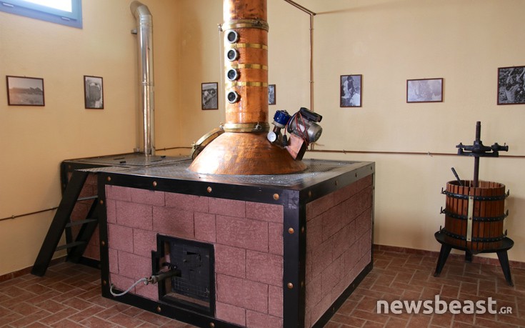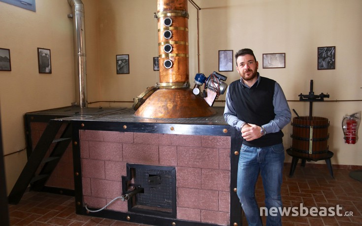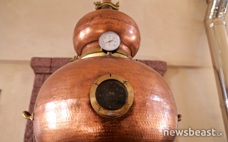 Δείχνοντάς μας το αποστακτήριο, συνεχίζει: «Βάζουμε τα στέμφυλα που έχουν γύρω στους 11-12% βαθμούς αλκοόλη και θα βγάλουμε το αποτέλεσμα που θέλουμε με τον βρασμό, καθώς το οινόπνευμα που είναι ελαφρύ, είναι εκείνο που φεύγει πρώτο. Γίνεται ατμός. Ελέγχουμε τη θερμοκρασία του ατμού πάνω από τα φινιστρίνια, ώστε να μην περάσουν κατάλοιπα από το οινόπνευμα. Ο ατμός πηγαίνει μέσα στον “λουλά”, στον ψύκτη. Εκεί ψύχεται και περνά στις δεξαμενές αυτόματα».