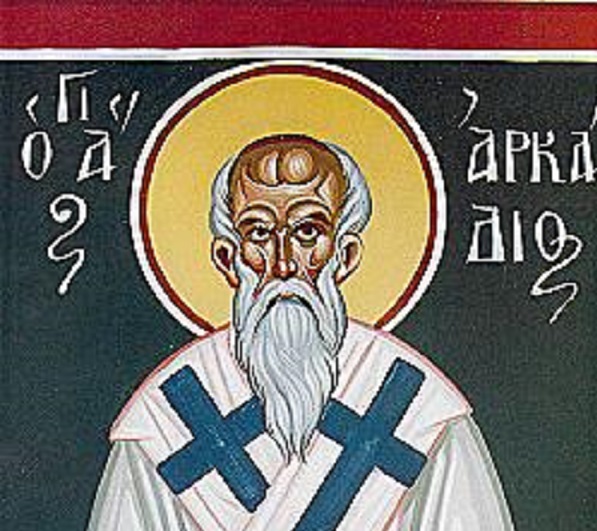 Ποιµήν ιερώτατος, της Αρσινόης οφθείς, την Κύπρον εφαίδρυνας, των αρετών τω φωτί, παµµάκαρ Αρκάδιε. Όθεν παρά Κυρίου, δοξασθείς επαξίως, σύσκηνος ανεδείχθης, των Αγίων απάντων, µεθ’ ων απαύστως πρέσβευε, υπέρ των ψυχών ηµών.