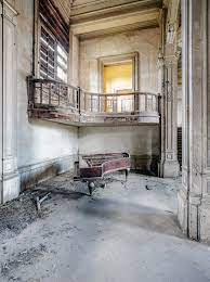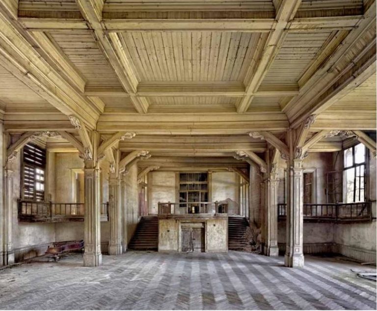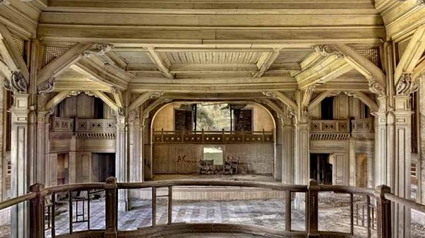 ένα τεράστιο, ξύλινο κτήριο, πέντε ορόφων στέκει ακόμη -όσο αντέχει- μέσα στο δάσος