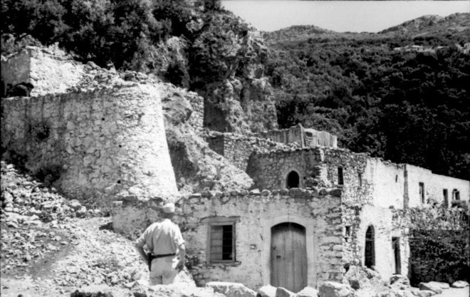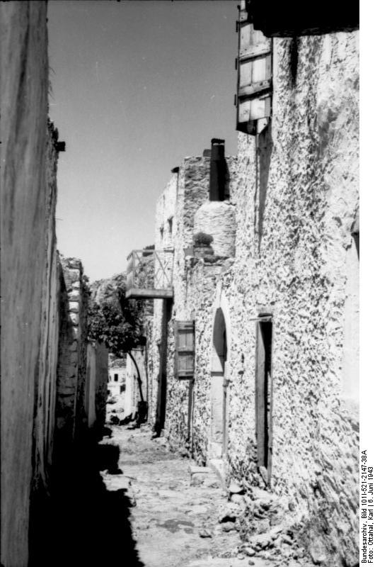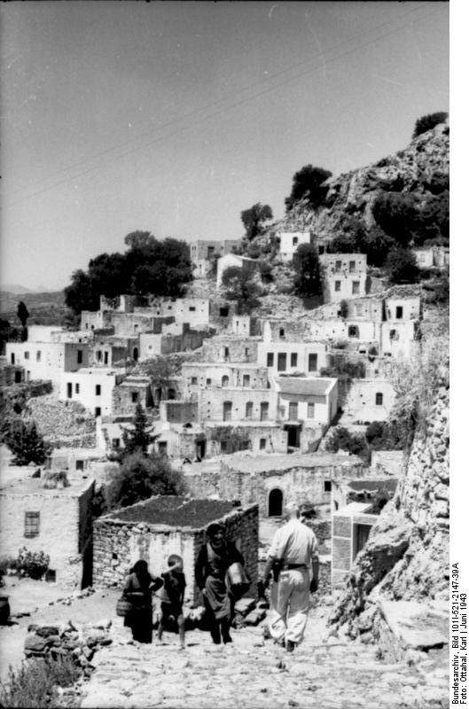 Die Südküste Kretas wird jetzt besonders von den deutschen Besatzungstruppen ausgebaut. Ano Wianos ein malerisches Gebirgsdorf im Süden, wird jetzt eine Straße nach Iccapetra ausgebaut. Ein sehr alter Bergahorn beschließt die alte Dorfstraße.