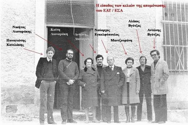 Ο Παναγιώτης Κανελλάκης, πρώτος αριστερά, με συναγωνιστές του έξω από τα κελιά του ΕΑΤ-ΕΣΑ