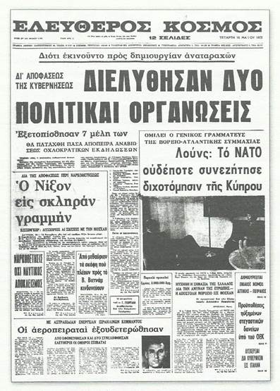 Πρωτοσέλιδα εφημερίδων της 10ης Μαΐου 1972 για τη διάλυση της ΕΚΙΝ και της ΕΜΕΠ