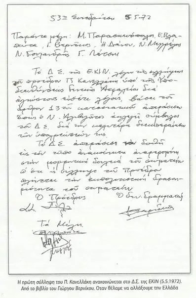 Το Πρακτικό του ΔΣ της ΕΚΙΝ μετά την πρώτη κλήση του Παναγιώτη Κανελλάκη στην Ασφάλεια, την 7η Ιουλίου 1971 (από το βιβλίο του Γιώργου Βερνίκου «Όταν θέλαμε να αλλάξουμε την Ελλάδα») (styga.gr)