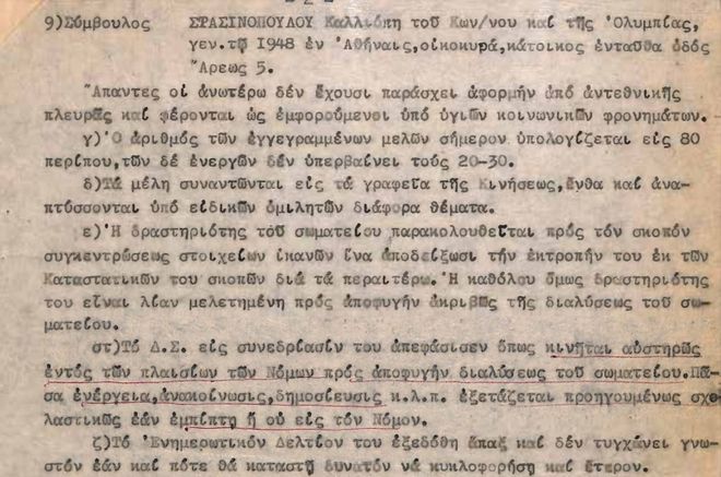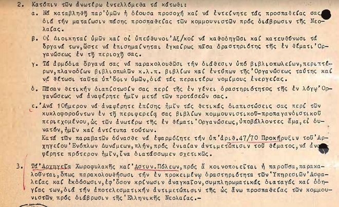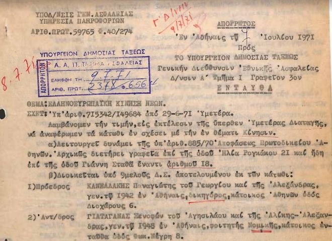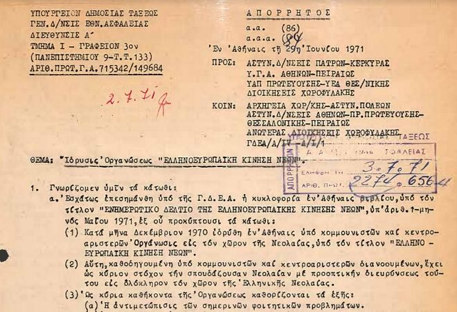 «Οι κομμουνισταί και οι κεντροαριστεροί διανοούμενοι, θέσαντες ως κύριον στόχον των την διάβρωσιν της νεολαίας, συνεκρότησαν από εξαμήνου και πλέον εις Αθήνας οργάνωσιν, ήτις ανέπτυξεν έντονον δραστηριότηταν εις τον χώρον των σπουδαστών και φοιτητών Ανωτέρων και Ανωτάτων Σχολών, διοργάνωσε συγκεντρώσεις και ομιλίες και έθεσεν εις κυκλοφορίαν βιβλία και περιοδικά προπαγανδιστικού περιεχομένου», αναφέρεται χαρακτηριστικά στο έγγραφο του Γενικού Διευθυντού Εθνικής Ασφαλείας, ο οποίος μάλιστα εγκαλεί τις υπηρεσίες ασφαλείας της πρωτεύουσας, γιατί δεν πήρε είδηση την δημιουργία της οργάνωσης: «Αι αρμόδιαι Υπηρεσίαι Ασφαλείας, ιδίως δε αι τοιαύται της Πρωτευούσης, εις την περιοχήν των οποίων από εξαμήνου και πλέον λαμβάνουσι χώραν διάφοροι εκδηλώσεις, δεν επεσήμαναν, ως διαπιστούται μετά λύπης μου, ούτε την δημιουργίαν της εν λόγω Οργανώσεως, ούτε την δραστηριότητα ταύτης. Το γεγονός τούτο είναι απαράδεκτον και μαρτυρεί, ότι δεν υφίσταται η δέουσα επαγρύπνησις των Υπηρεσιών Ασφαλείας εις τον ζωτικόν χώρον της Νεολαίας και ειδικώτερον εις τους χώρους των Ανωτέρων και Ανωτάτων Εκπαιδευτικών Ιδρυμάτων …!».