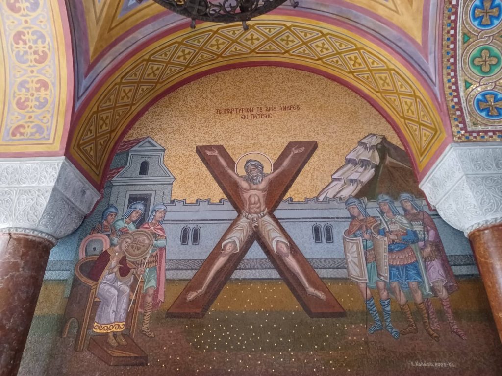 Γι’ αυτό το λόγο ο Αιγεάτης διέταξε τη σύλληψη και τη φυλάκιση του Αποστόλου Ανδρέα, ο οποίος μέσα από τη φυλακή χειροτόνησε τον Στρατοκλή πρώτο επίσκοπο Πατρών. Σε ηλικία 70 ετών, ο Άγιος Απόστολος Ανδρέας οδηγήθηκε στο σημείο όπου κήρυττε, κοντά στην παραλία της Πάτρας, όπου σταυρώθηκε, το έτος 66 μ.Χ., επί αυτοκράτορος Νέρωνα. Από ταπείνωση και ευλάβεια προς τον Κύριο, ο Άγιος Ανδρέας ζήτησε να σταυρωθεί σε σταυρό άλλου σχήματος, ώστε να μην ταυτίζεται ο σταυρός του με τον Τίμιο και Ζωοποιό Σταυρό επάνω στον οποίο σταυρώθηκε ο Χριστός και Δάσκαλός Του. Για τούτο ο σταυρός του αγίου Ανδρέα φέρει σχήμα X. Στο σημείο του μαρτυρίου του ανεγέρθηκε ο παλαιός ιερός ναός αφιερωμένος στη χάρη Του, παραπλεύρως του νέου μεγαλοπρεπούς ναού στην παραλία της πόλης.