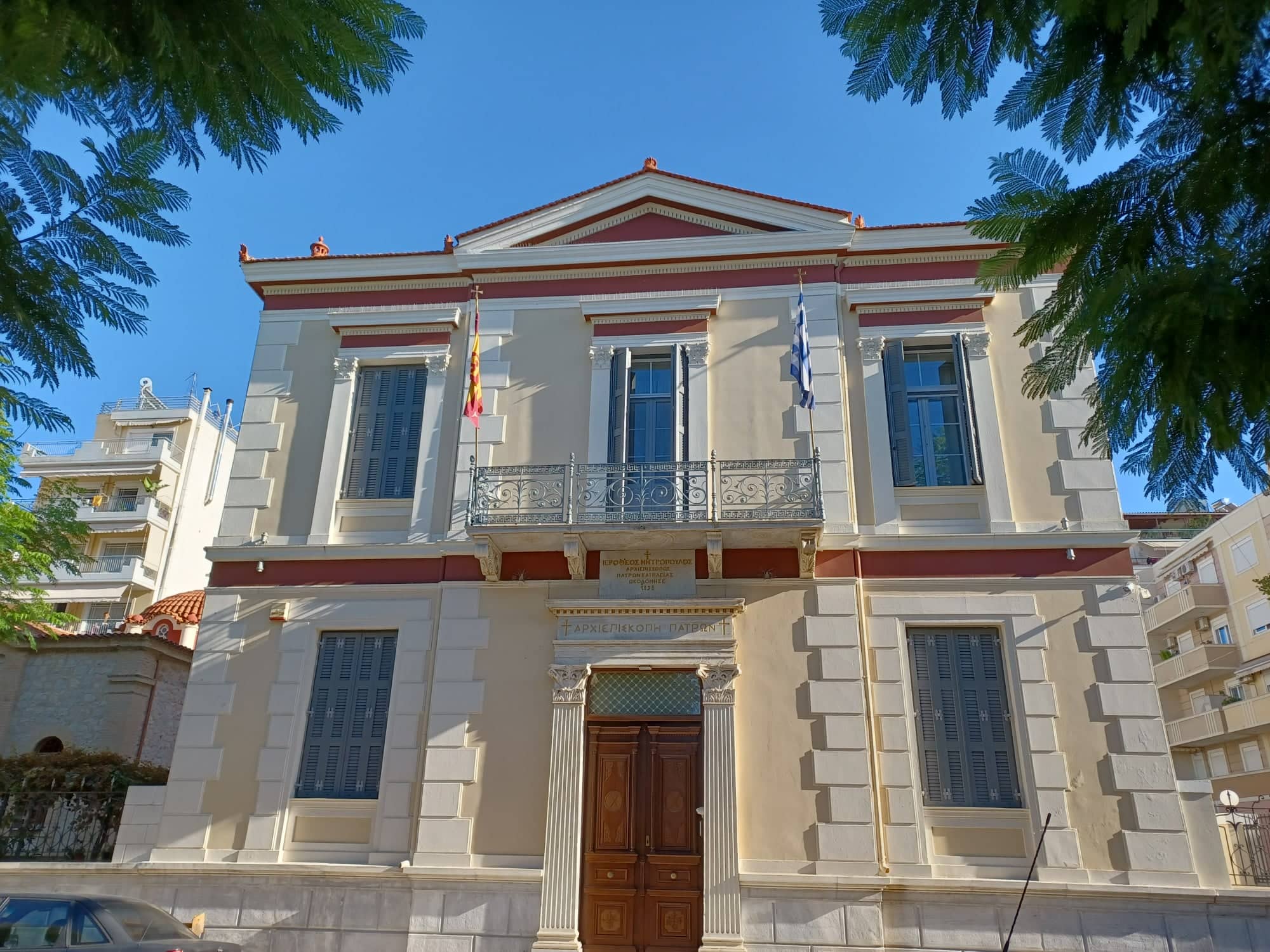 Το Μέγαρο της Ιεράς Επισκοπής Πατρών και ο ιερός ναός Αγίου Ιωάννου του Θεολόγου πλησίον του ιερού ναού Αγίου Ανδρέα