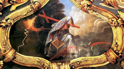 Ο Άγιος Σπυρίδων νικάει την πανώλη με τη δύναμη του Τιμίου Σταυρού (λεπτομέρεια από τοιχογραφία στο θόλο του ιερού ναού του στην Κέρκυρα) (corfutvnews.gr, noiazomai.gr)