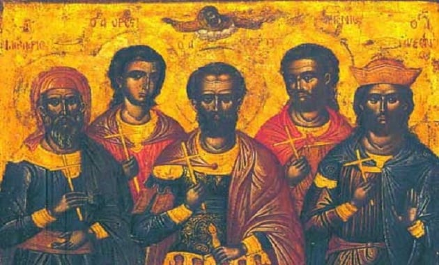 Οι Άγιοι Πέντε Μάρτυρες Ευστράτιος, Αυξέντιος, Ευγένιος, Μαρδάριος και Ορέστης, άθλησαν στην Καππαδοκία τον καιρό της βασιλείας των Ρωμαίων Αυτοκρατόρων Διοκλητιανού και Μαξιμιανού, το 296 μ.Χ. Τότε είχε ξεσπάσει ο φοβερότερος ίσως διωγμός εναντίον των χριστιανών, που είχε σκοπό να εξαλείψει από το πρόσωπο της γης κάθε χριστιανό.