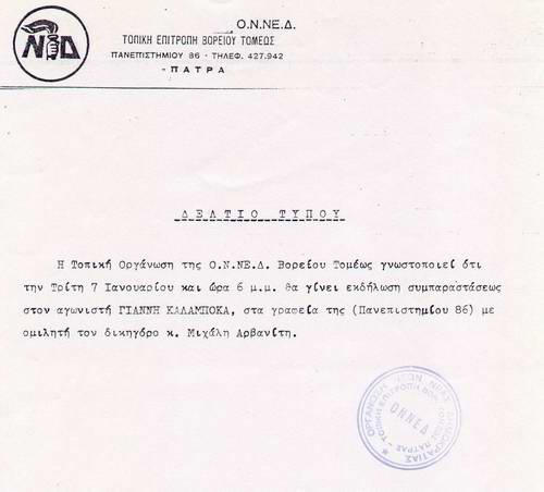 Δελτίο Τύπου της ΟΝΝΕΔ σχετικά με εκδηλώσεις συμπαράστασης στον Ι. Καλαμπόκα