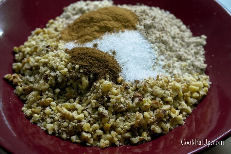 Κόβουμε το καρύδι σε μικρά κομμάτια. Αν βάλουμε αμύγδαλο, το ψιλοκόβουμε στο μούλτι. Ανακατεύουμε όλα μαζί τα υλικά της γέμισης.