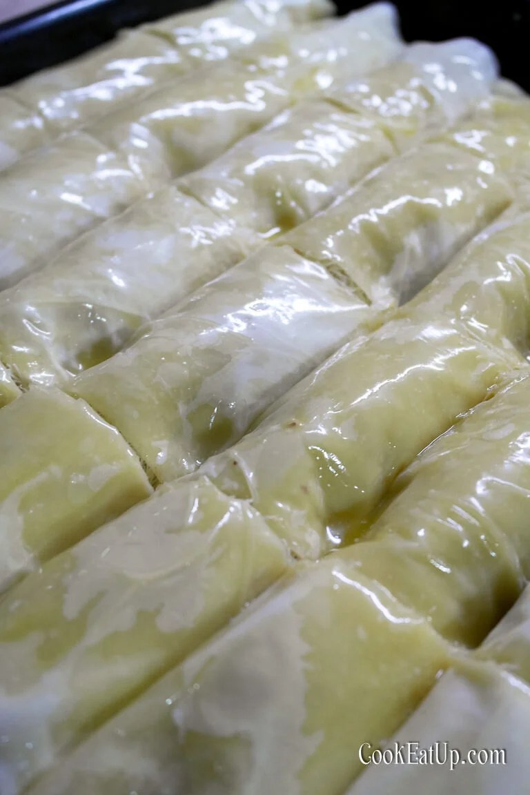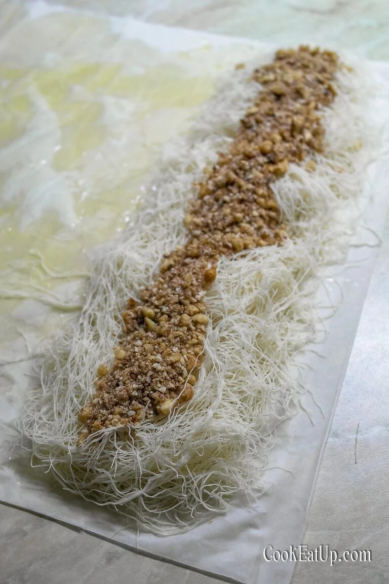 Λιώνουμε το βούτυρο. Ξάνουμε το κανταΐφι πολύ καλά. Απλώνουμε στον πάγκο μας 2 φύλλα κρούστας. Κάθε φύλλο που απλώνουμε το βουτυρώνουμε. Από πάνω, στη μία άκρη, τη στενή, απλώνουμε κατά μήκος το 1/7 από το κανταΐφι και από πάνω σκορπίζουμε το 1/7 από τη γέμιση. Ρίχνουμε 2 κουταλιές της σούπας λιωμένο βούτυρο στη γέμιση και στο κανταΐφι. Τυλίγουμε απαλά το φύλλο κρούστας σε ρολό και το τοποθετούμε στο ταψί. Συνεχίζουμε με τα άλλα 6 ρολά. Ρίχνουμε το υπόλοιπο βούτυρο στην επιφάνεια. Όταν λιώνουμε το βούτυρο δεν χρησιμοποιούμε ποτέ το άσπρο κατακάθι που περιέχει τα στερεά κατάλοιπα του γάλακτος και βρίσκεται στον πάτο της κατσαρόλας, μόνο το κίτρινο διαυγές υγρό που είναι το βούτυρο. Κόβουμε τα ρολά μέχρι κάτω σε 4 ή περισσότερα κομμάτια. Καλό είναι πριν το κόψουμε να μπει το ταψί στο ψυγείο για να παγώσει το βούτυρο, αν χωράει φυσικά. Με αυτόν τον τρόπο, κόβεται πιο εύκολα αλλά γίνεται και πιο τραγανό το γλυκό μας όταν ψηθεί. Ψήνουμε στους 150 βαθμούς στις αντιστάσεις μέχρι να ροδίσει η επιφάνεια, γύρω στη 1,5 με 2 ώρες ανάλογα το φούρνο.
