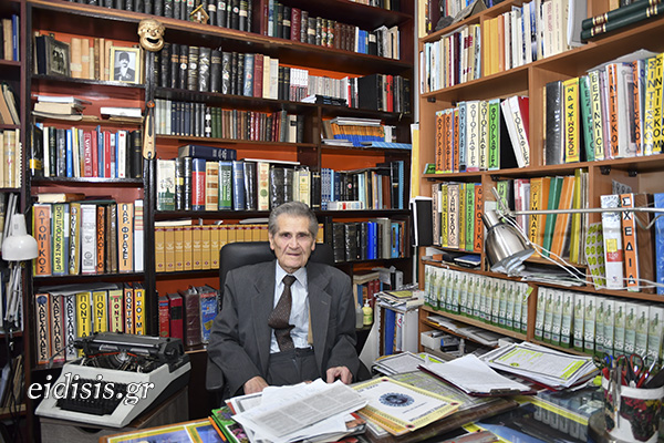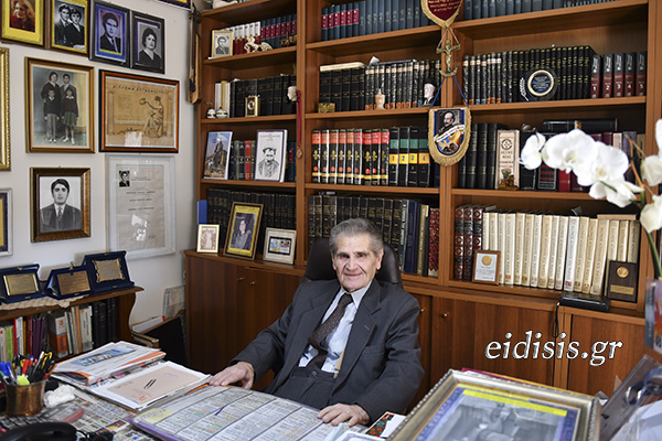 Ολόκληρη η οικία του είναι γεμάτη από βιβλία. Δεν υπάρχει πουθενά ελεύθερος χώρος. Βιβλιοθήκες φορτωμένες με εγκυκλοπαιδικά και γλωσσικά λεξικά με ποντιακά κι άλλα περιοδικά, στοιχεία, ντοκουμέντα, αντίγραφα από πρακτικά και πρωτόκολλα ανεκτίμητης ιστορικής αξίας, σχολικοί και στατιστικοί κατάλογοι, πλήθος από αποδελτιωμένα άρθρα, η ιστορία της Πρωτοβάθμιας και Δευτεροβάθμιας εκπαίδευσης στο Κιλκίς του περασμένου αιώνα και διάφορα άλλα βιβλία, ων ουκ έστιν αριθμός, συνθέτουν ένα πλούσιο αρχειακό υλικό που για να το μελετήσει κανείς, χρειάζεται κάμποσα χρόνια. Δεν υπάρχει ούτε ένα δωμάτιο που να μην είναι βιβλιοθήκη. Δεν υπάρχει τοίχος που να μην είναι καλυμμένος με φωτογραφίες…