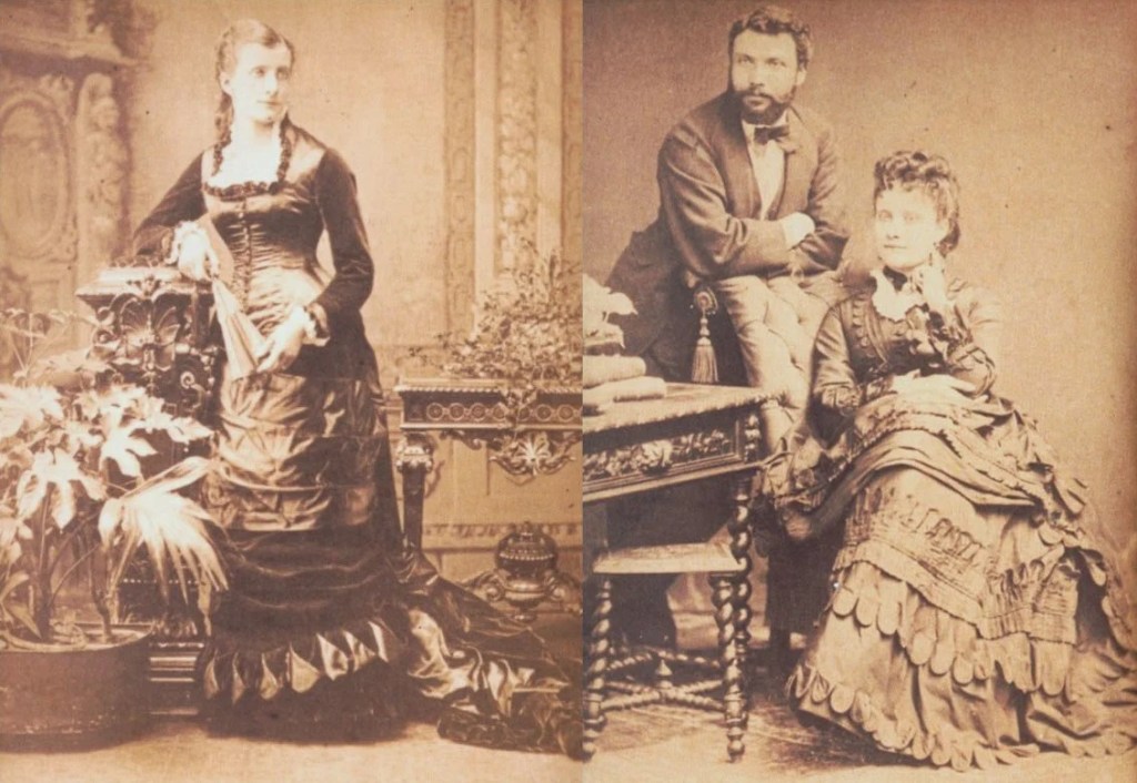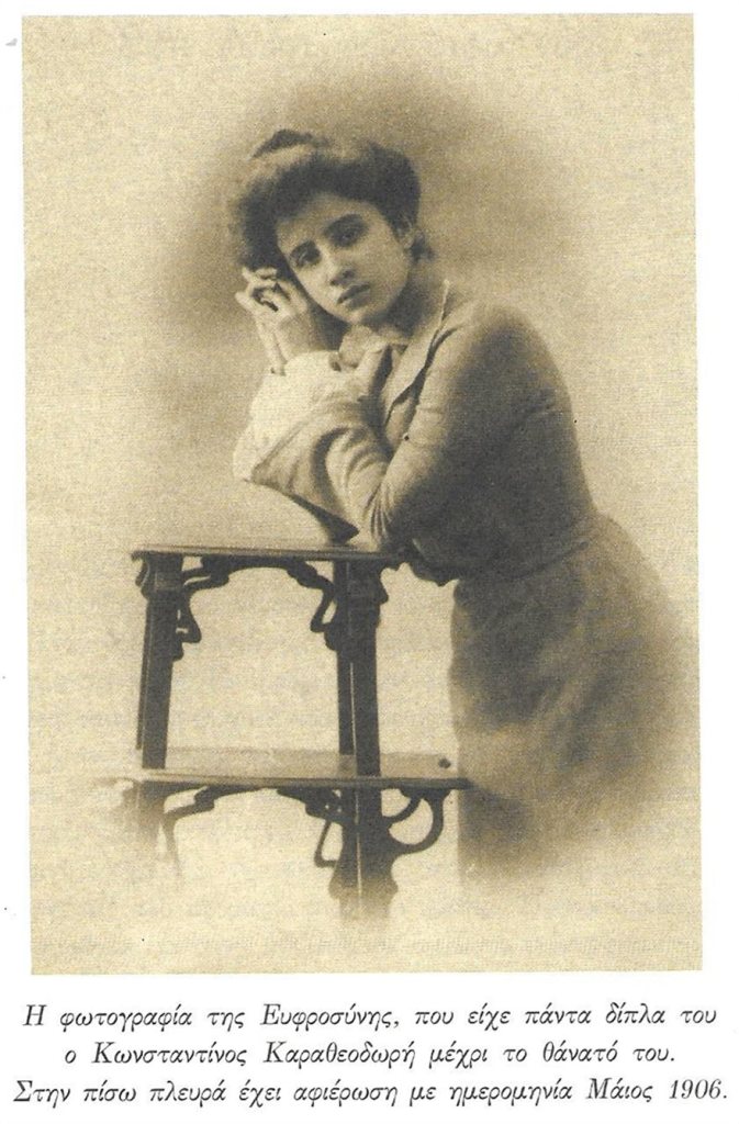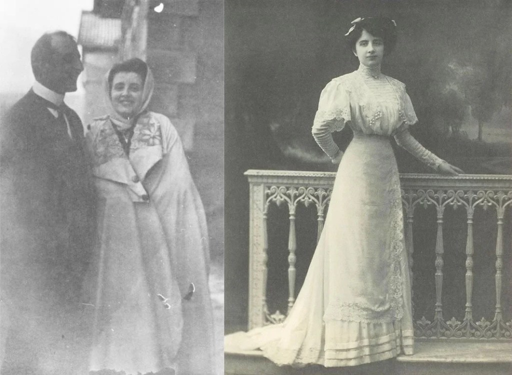 Ο Κωνσταντίνος Καραθεοδωρή με τη σύζυγό του Ευφροσύνη στο Göttingen, το 1915. Δεξιά, η Ευφροσύνη την ημέρα του γάμου τους στην Κωνσταντινούπολη, το 1908