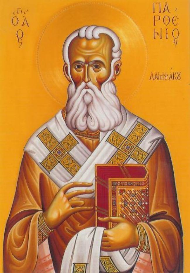 Τῆς Λαμψάκου ὁ μέγας θαυματουργός, ἀναβὰς ἐν τῷ ὕψει τῶν ἀρετῶν, ἀστράπτεις τοῖς πέρασι, τῷ φωτὶ τῶν ἰάσεων, τοὺς ζοφώδεις Δαίμονας, σκορπίζων φαιδρότατα, καὶ ἐλαύνων νόσους, χρησταῖς ἐπικλήσεσιν· ὅθεν καὶ τῆς πλάνης, τῶν εἰδώλων καθάρας, πᾶσαν τὴν Ἑλλήσποντον, καταλάμπεις τοῖς θαύμασι, Θεοφόρε Παρθένιε, πρέσβευε Χριστῷ τῷ Θεῷ, τῶν πταισμάτων ἄφεσιν δωρήσασθαι, τοῖς ἑορτάζουσι πόθῳ, τὴν ἁγίαν μνήμην σου.
