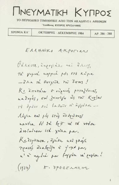 Το μεταφρασμένο από τη Σόφη Κεφάλα κείμενο είχε συμπεριληφθεί σε αφιέρωμα που είχε ετοιμάσει το περιοδικό «Πνευματική Κύπρος» για τον Πρεβελάκη το 1984 (Οκτώβριος – Δεκέμβριος, αρ. 286-288). Τιμώντας τα εβδομηνταπεντάχρονα του συγγραφέα, το περιοδικό είχε συγκεντρώσει ορισμένες ξένες κριτικές σε ελληνική μετάφραση υπό το γενικό τίτλο «Αφιέρωμα στον Παντελή Πρεβελάκη – Πώς είδε ο ξένος Τύπος το έργο του».