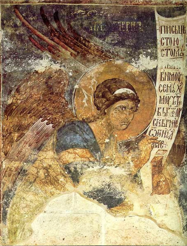 α. Ο Αρχάγγελος Γαβριήλ, ψηφιδωτή παράσταση από τον περίφημο διάκοσμο του ιερού ναού της Παναγίας της Μαρτοράνα, στο Παλέρμο της Σικελίας (12ος αι. μ.Χ.), β. Ο Αρχάγγελος Γαβριήλ, τοιχογραφία από την ιερά Μονή Ντετσάνι, Ρουμανία, γ. Αρχάγγελος Γαβριήλ, εικόνα από τον ιερό ναό Αρχαγγέλου Μιχαήλ Πανορμίτη, στη Σύμη