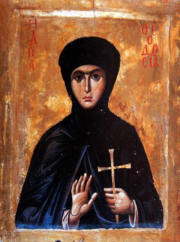 Η Αγία Οσιομάρτυς Θεοδοσία καταγόταν από την Κωνσταντινούπολη και γεννήθηκε από γονείς πλουσίους και ευσεβείς στα χρόνια του αυτοκράτορα Θεοδοσίου του Αδραμυττηνού. Σε ηλικία επτά ετών, αφού έμεινε ορφανή από πατέρα, εισήλθε σε μοναστήρι, όπου μετά από λίγο εκάρη μοναχή. Μετά τον θάνατο και της μητέρας της, αφού πούλησε και διαμοίρασε στους φτωχούς τα υπάρχοντά της και απαλλάχτηκε έτσι από τις γήινες φροντίδες, επιδόθηκε με μεγαλύτερο ζήλο στην απόκτηση της τελειότητας και των μοναχικών αρετών, ασκούμενη στη μονή που βρισκόταν κοντά στο «Σκοτεινόν φρέαρ» και ονομαζόταν «Άσπαρον στέρνην». Όταν ανήλθε στον θρόνο ο Λέων ο Ίσαυρος (717-741 μ.Χ.) εξαπολύθηκε άγριος διωγμός εναντίον των εικονόφιλων και των ιερών εικόνων, ο δε πατριάρχης Γερμανός, στερεός προμαχώνας της Ορθοδοξίας, εκδιώχθηκε και αντικαταστάθηκε από τον εικονομάχο Αναστάσιο. Κατά την έναρξη του διωγμού διατάχθηκε η καθαίρεση και καταστροφή της εικόνας του Χριστού, η οποία βρισκόταν επί της Χαλκής Πύλης.