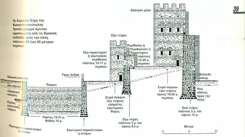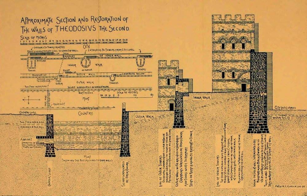 Περί τα 20 μ. από το προτείχισμα (ο ενδιάμεσος χώρος ονομαζόταν «παρατείχιον») βρισκόταν η τάφρος, η πρώτη γραμμή άμυνας των Θεοδοσιανών τειχών. Είχε πλάτος 15-20 μ. και βάθος 5-7 μ. Οι πλευρές της ήταν χτισμένες με λίθους, ενώ ανά διαστήματα υπήρχαν λίθινοι υδατοφράκτες για να εμποδίζουν το νερό να κυλάει προς τον Κεράτιο λόγω της υψομετρικής διαφοράς. Πάνω από το εσωτερικό χείλος της τάφρου υψωνόταν χαμηλός τοίχος ύψους περίπου 2 μέτρων.