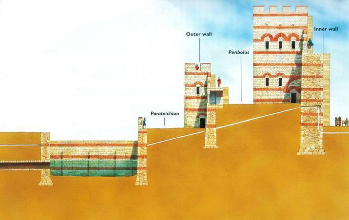 Από την εποχή που ο επώνυμος Μεγαρέας ιδρυτής της πόλης του Βυζαντίου, ο Βύζας, έφτασε στη περιοχή το 667 π.Χ., διέκρινε τη στρατηγική σημασία της τοποθεσίας καθώς και την ευκολία που παρείχε στην άμυνα, καθώς περικυκλωνόταν από τη θάλασσα σε τρεις πλευρές. Συγκεκριμένα, βρεχόταν από τον Κεράτιο κόλπο από το βορρά, από τον Βόσπορο στα ανατολικά και από τη Θάλασσα του Μαρμαρά στον νότο, ενώ επικοινωνούσε με την ξηρά από τα δυτικά προς τη Θρακική πεδιάδα. Προς την πλευρά της Θράκης λοιπόν χτίστηκε το πρώτο τείχος της Πόλης. Τα τείχη του Βυζαντίου ήταν σαφώς μικρότερα των επομένων που θα κτιστούν για την Κωνσταντινούπολη, καθώς και η ίδια η Βασιλεύουσα ήταν πολύ μεγαλύτερη. Τα τείχη επεκτάθηκαν πρώτα από τον Ρωμαίο Σεπτίμιο Σεβήρο και ύστερα από τον Κωνσταντίνο τον Μεγάλο και τελικά πήραν την τελική τους μορφή επί Θεοδοσίου Β’.