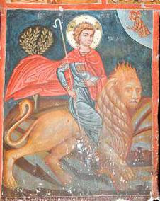 Στην κάτω ζώνη, στα νότια της δυτικής θύρας, εικονίζεται ο Άγιος Μάμας πάνω σε λιοντάρι και, στα βόρεια, ο Άγιος Γεώργιος καβαλάρης σε άλογο. Στη νότια πλευρά της δυτικής θύρας, εικονίζεται ο Άγιος Σωζόμενος και, στη βόρεια, ο Άγιος Ανδρόνικος. Μαζί με τον καθένα και ένας Σταυρός αποτροπαϊκός (που αποτρέπει το κακό).