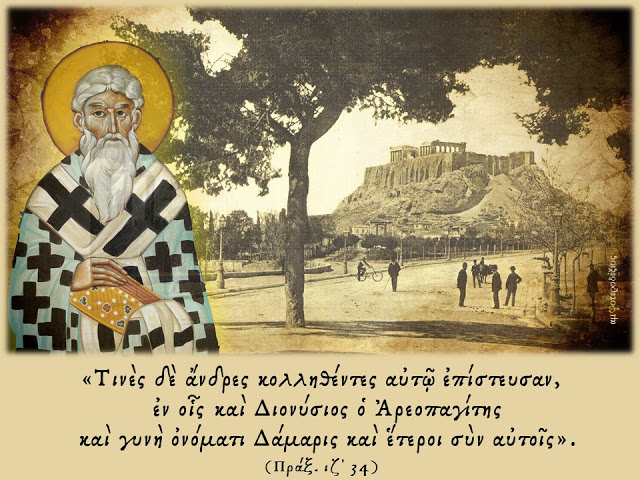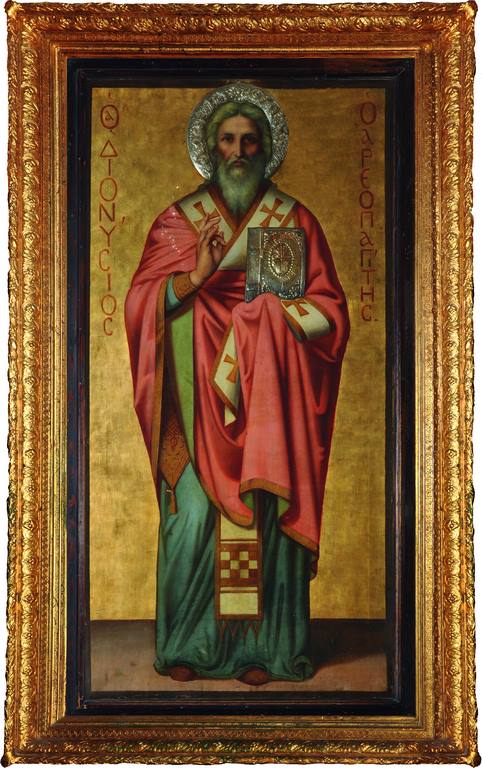 Ο Άγιος Διονύσιος καταγόταν από την πόλη των Αθηνών. Μαρτύρησε το 96 μ.Χ., στα χρόνια του αυτοκράτορα Δομετιανού. Διακρίθηκε για τη φιλοσοφική του κατάρτιση και τη βαθιά του καλλιέργεια. Αρχικά υπήρξε ειδωλολάτρης δικαστής, μέλος της Βουλής του Αρείου Πάγου. Το κήρυγμα όμως του Αποστόλου Παύλου στην Αθήνα άγγιξε την παιδευμένη και ευαίσθητη ψυχή του και βαπτίσθηκε χριστιανός. Διαδέχθηκε στον επισκοπικό θρόνο των Αθηνών τον ευσεβή Άγιο Ιερόθεο και επιτέλεσε εν ζωή πολλά θαύματα.