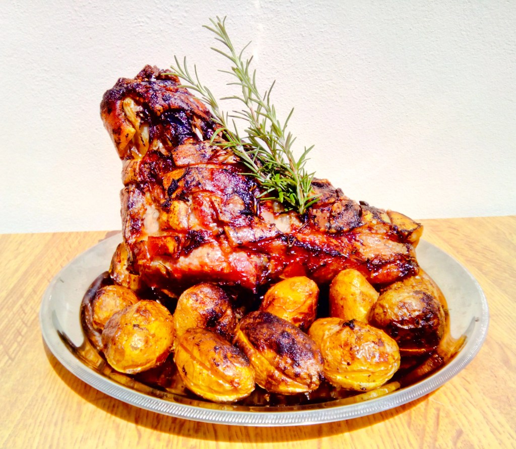 Μαρινάρουμε τα κότσια από το προηγούμενο βράδυ. Αρχικά πλένουμε τα κότσια τα τρίβουμε με αλάτι, πιπέρι και μουστάρδα. Στη συνέχεια βάζουμε σε ένα μπολ όλα τα υπόλοιπα υλικά της μαρινάδας, ανακατεύουμε και περιχύνουμε τα κότσια, τα οποία έχουμε τοποθετήσει στη γάστρα. Τα αφήνουμε στο ψυγείο και φροντίζουμε να τα γυρίσουμε και από την άλλη πλευρά μέχρι τη στιγμή που θα τα μαγειρέψουμε. Προθερμαίνουμε τον φούρνο στους 250 βαθμούς. Προσθέτουμε στη γάστρα τα λαχανικά γύρω από τα κότσια. Ψήνουμε στην αρχή για μισή ώρα στους 250 βαθμούς στις αντιστάσεις πάνω – κάτω. Χαμηλώνουμε στους 150 βαθμούς και ψήνουμε για περίπου 2 ώρες ακόμα. Ελέγχουμε αν χρειάζεται νερό, αν και θα βγάλουν υγρά και τα λαχανικά. Τα τελευταία 15 λεπτά αφαιρούμε το καπάκι από τη γάστρα για να ροδίσει το φαγητό καλύτερα. Μπορούμε να βάλουμε κάτω από τα κότσια πατάτες κομμένες στα τέσσερα για μιάμιση ώρα περίπου, ώστε να μελώσουν από τη μαρινάδα και τα λαχανικά και να γίνουν πεντανόστιμες! Σερβίρουμε το φαγητό μας ζεστό. Συνοδεύει ιδανικά και ζυμαρικά και πιλάφι, αν δεν έχουμε προσθέσει τις πατάτες.