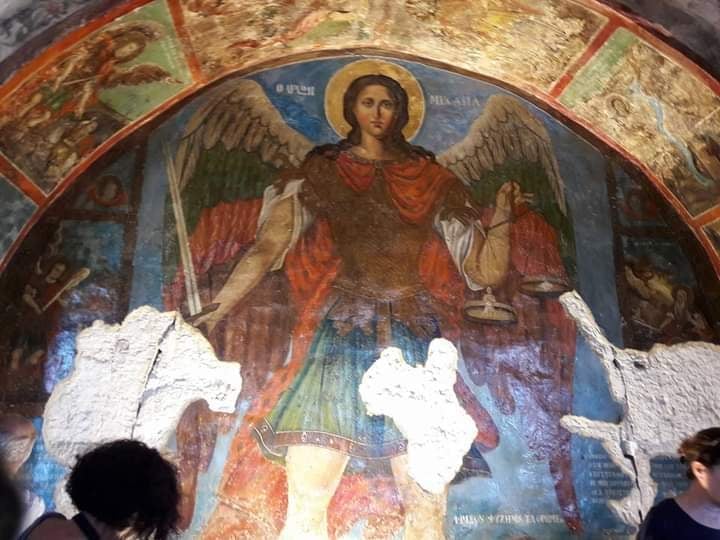 Ο Ταξιάρχης Μιχαήλ (τοιχογραφία του 12ου μ.Χ. αι.) στο κατεχόμενο Λευκόνοικο. Ο ναός που είχε συληθεί και εγκαταλειφθεί, ανακαινίστηκε πριν λίγα χρόνια και αμέσως μετά παραδόθηκε για να χρησιμοποιηθεί ως εκθεσιακό κέντρο σε τουρκοκυπριακό μπαζάρ…