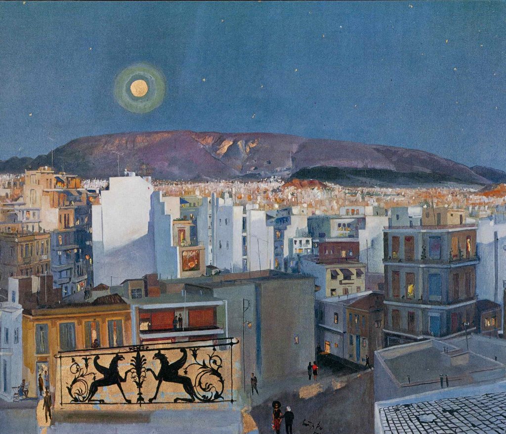 Και ο τρόπος είναι η ονειρική ατμόσφαιρα μέσα στην οποία χτίζει την εικόνα του, μεταξύ ουρανού και γης. Η γη είναι η Αθήνα του, είναι οι γειτονιές με τα σπίτια τους, πολλά νεοκλασικά, με χρώματα, όπου κυριαρχεί το πεθαμένο βυσσινί ή η ώχρα, με κάποιες σιδεριές, που ξέμειναν από παλιά, απεικονίζοντας αρχαίους γρύπες. Κάτω στο δρόμο ο κόσμος να κυκλοφορεί, με την πόλη, όμως, να επιβάλλεται πάντα πάνω στον άνθρωπο.