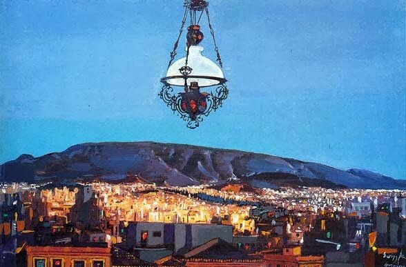 Ο ουρανός του κρέμεται πάνω από την Αθήνα του όχι συμπληρωματικά, όπως συμβαίνει συνήθως με τα τοπία, αλλά πρωταγωνιστικά. Άλλοτε είναι μπλε, όχι το κλασικό γαλάζιο, ή κόκκινος, σκούρος κόκκινος. Και το σήμα κατατεθέν τους η παλιά λάμπα που κρέμεται απ’ αυτόν! Όχι από το ταβάνι κάποιου σπιτιού, αλλά από τον ουράνιο θόλο της Αθήνας.