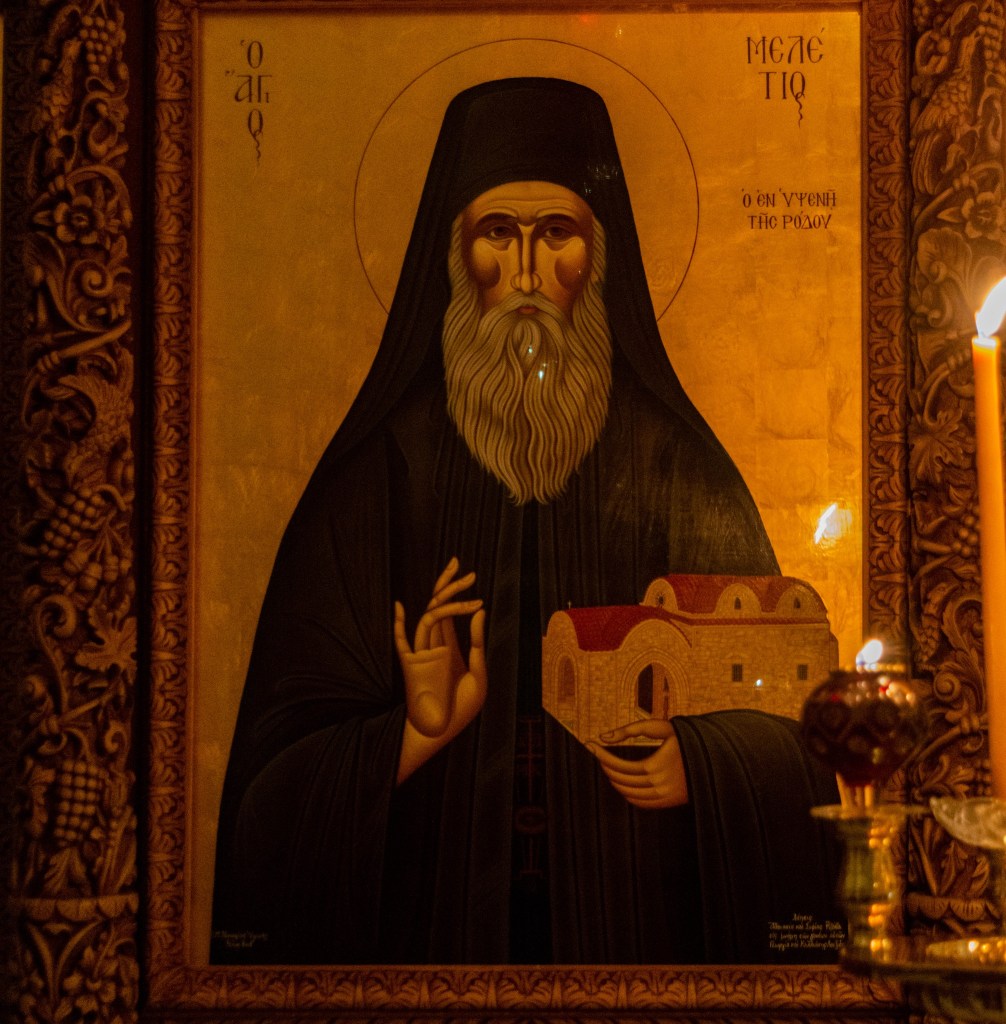 Χαίροις τῶν Ὁσίων ὁ μιμητής, καὶ ζωῆς ἁγίας, ὁ θεόπνους ὑφηγητής· χαίροις Θεοτόκου, ὁ γνήσιος θεράπων, Μελέτιε θεόφρον, Ἀγγέλων σύσκηνε.