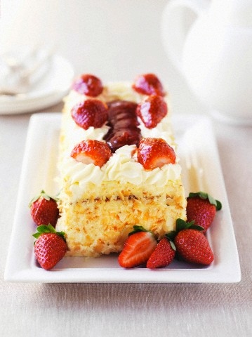 Για το παντεσπάνι: Χτυπάμε τα αυγά με τη ζάχαρη και τη βανίλια ν’ αφρατέψουν. Κοσκινίζουμε το αλεύρι και το μπέικιν και τα προσθέτουμε σταδιακά στο μείγμα, ανακατεύουμε ελαφρά με σπάτουλα να ομογενοποιηθεί το μείγμα. Βουτυρώνουμε και αλευρώνουμε μία φόρμα ή ένα τσέρκι περίπου 25 εκ. Ψήνουμε για 20 λεπτά στους 180°C. Αφήνουμε να κρυώσει πριν το κόψουμε.