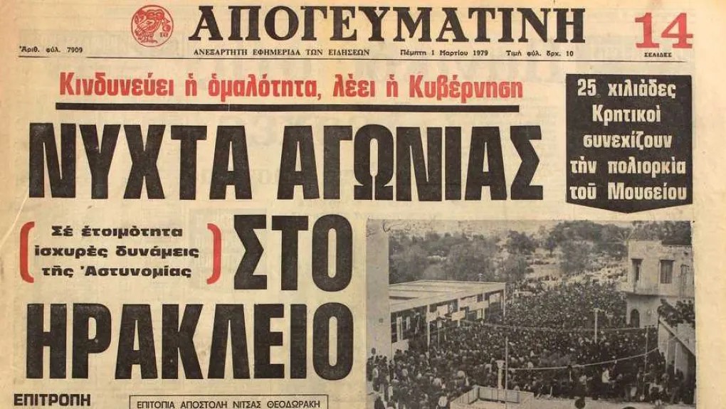Είναι πιθανώς από τις μεγαλύτερες κινητοποιήσεις που έκανε ποτέ ο λαός του Ηρακλείου στο δεύτερο μισό του 20ού αιώνα. Επί σχεδόν μία εβδομάδα, τις τελευταίες ημέρες του Φλεβάρη του 1979, χιλιάδες Ηρακλειώτες είχαν ζώσει το Αρχαιολογικό Μουσείο της πόλης τους, περιφρουρώντας με τον τρόπο αυτό τους αρχαιολογικούς θησαυρούς, ώστε να μην μεταφερθούν στην Αμερική, όπως είχε αποφασίσει η τότε κυβέρνηση του Κωνσταντίνου Καραμανλή. Ο φόβος ήταν μήπως τα αρχαία δεν επιστρέψουν ποτέ στην Κρήτη.
