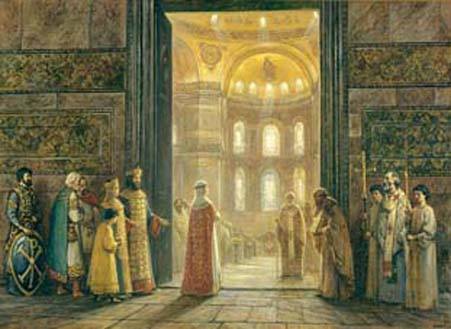 Πόλις του Κωνσταντίνου, Πρωτόθρονη της Οικουμένης, η Βασιλεύουσα των Ελλήνων, Πόλις των πόλεων… αμέτρητα τα ονόματα και οι τίτλοι που της προσέδωσαν μέσα στα χρόνια. Η χιλιόχρονη αυτοκρατορία που, αν και κατακτήθηκε από τους Λατίνους το 1204 και από τους Οθωμανούς το 1453, έμεινε πάντοτε, παρ’ όλα τα παθήματά της, αναφορά αιώνιας αίγλης και αθάνατου μεγαλείου. Τα σύνορά της εκτείνονταν ως τον ουρανό, όπως μαρτυρούν τα μοναδικής τέχνης ψηφιδωτά της Αγίας Σοφίας, που απεικονίζουν τους ένδοξους Βυζαντινούς αυτοκράτορες να προσφέρουν και να τείνουν την πόλη, τα λαμπρά οικοδομήματά της και τον λαό της προς τον ίδιο το Θεό και την Υπεραγία Θεοτόκο!