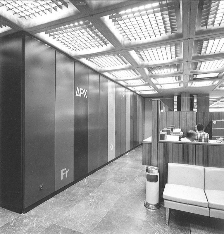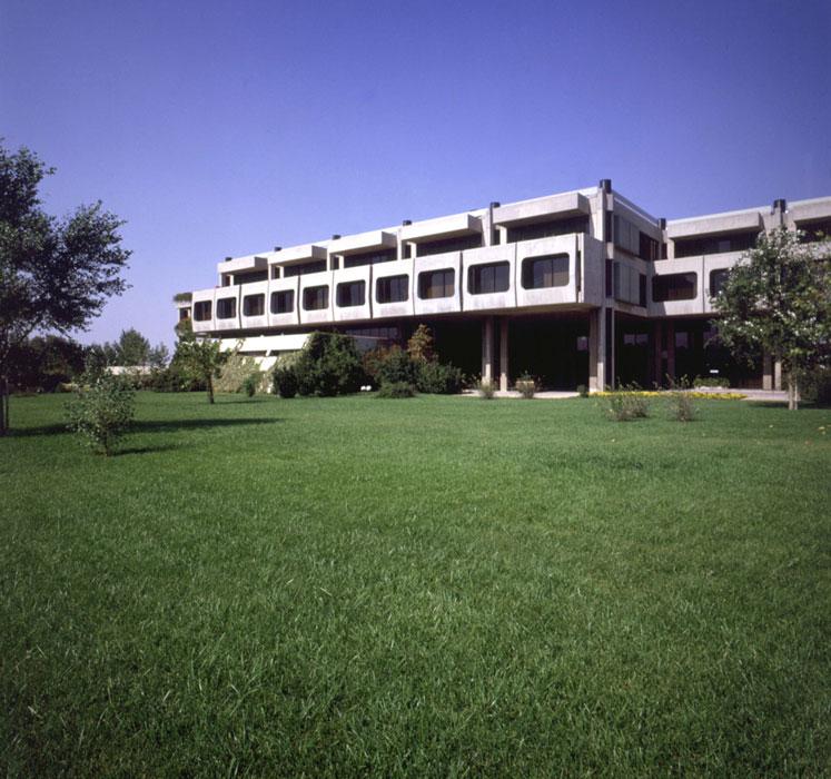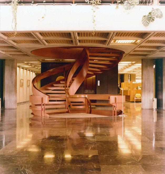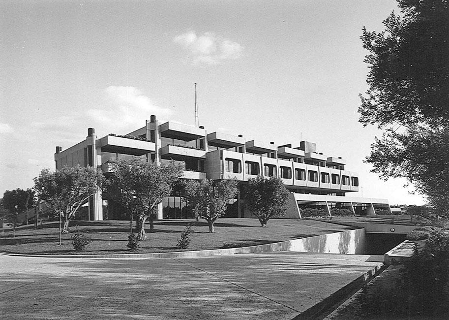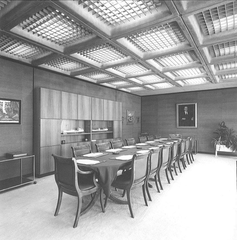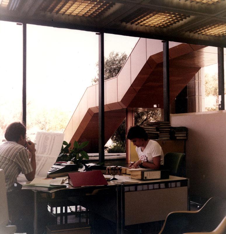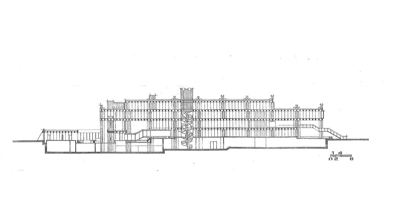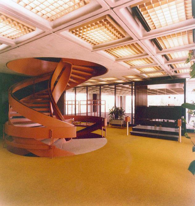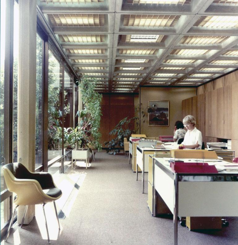 Στο δεύτερο και χωριστό τμήμα του ισογείου βρίσκονται τα γραφεία της διοίκησης. Ιδιωτικά γραφεία και άλλοι χώροι συνεδριάσεων αναπτύσσονται γύρω από ένα κεντρικό αίθριο με λίμνη. Το τμήμα διοίκησης ενώνεται με το υπόλοιπο κτήριο μέσω κλειστής πεζογέφυρας. Στον μεσώροφο του κτηρίου βρίσκονται γραφειακοί χώροι και χώροι γενικής εξυπηρέτησης (πρωτόκολλο, φωτοτυπείο κ.λπ.). Το προσωπικό εισέρχεται στο κτήριο μέσω πεζογέφυρας που οδηγεί από τον εξωτερικό χώρο στάθμευσης αυτοκινήτων κατ’ ευθείαν στον μεσώροφο. Με αυτό τον τρόπο η είσοδος στο κτήριο πραγματοποιείται στην υπερυψωμένη στάθμη του μεσωρόφου.