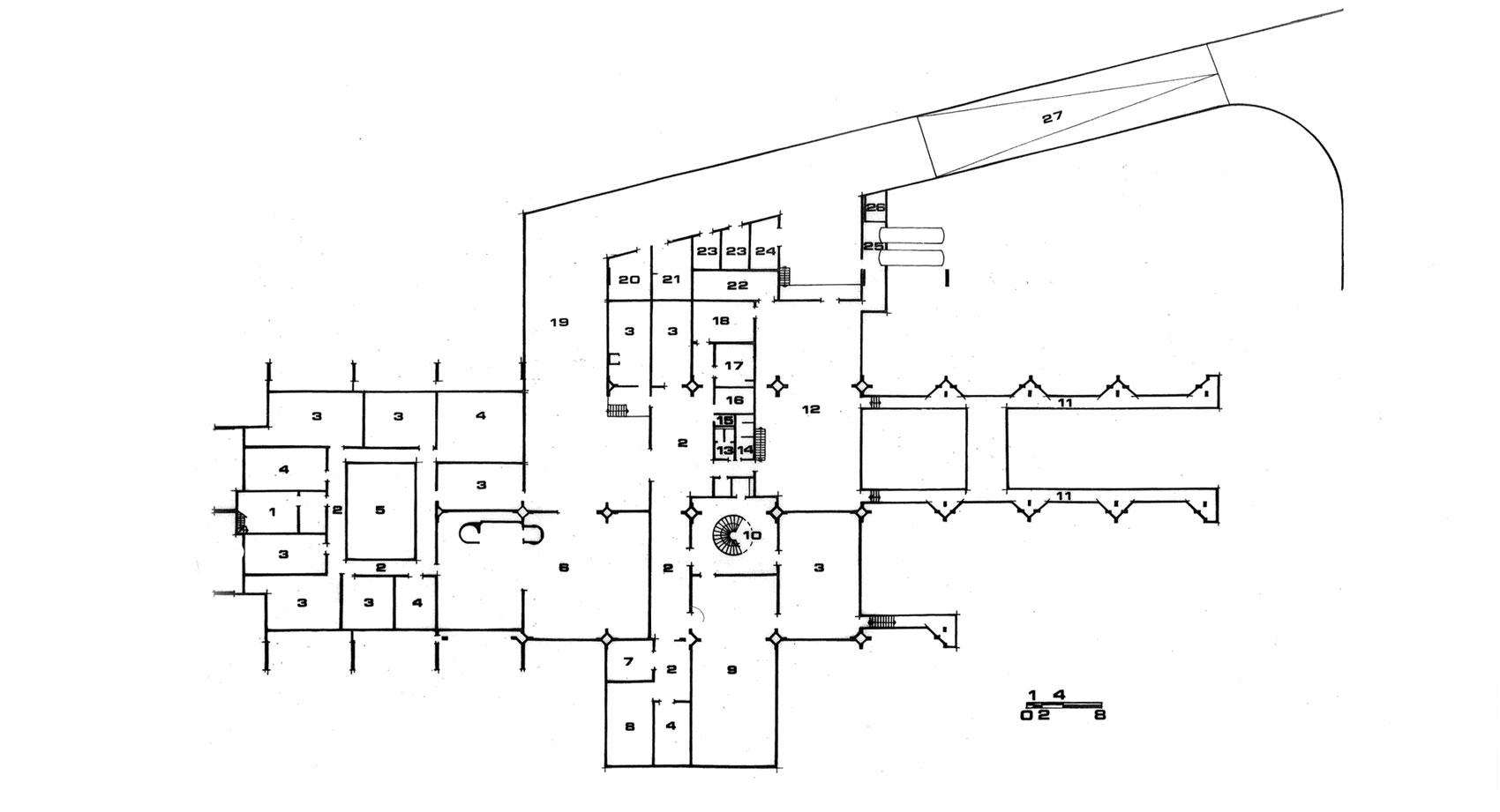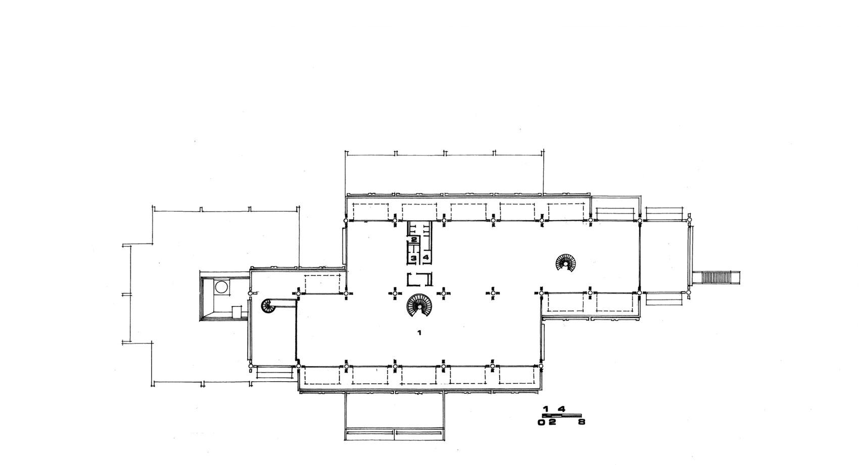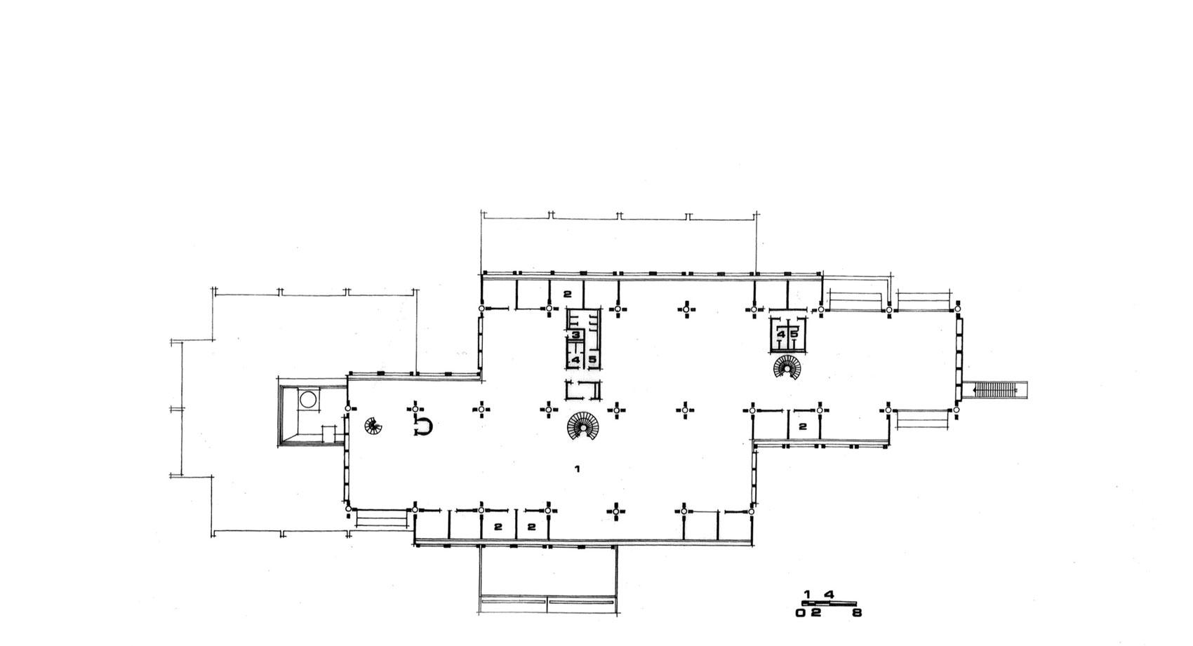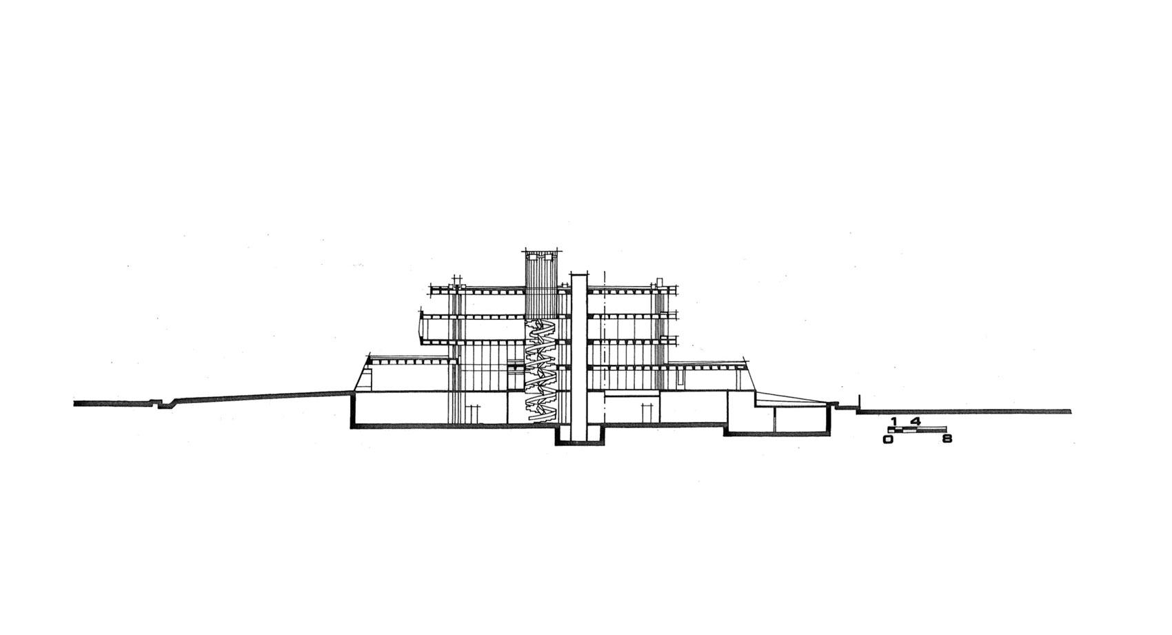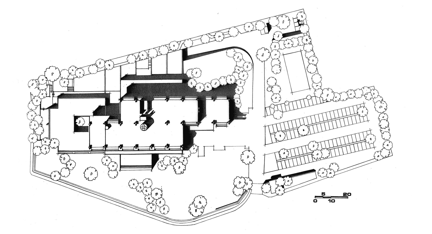 Στο υπόγειο προβλέπονται βοηθητικοί χώροι, αποθήκες, μηχανοστάσιο, μικρός χώρος στάθμευσης δέκα αυτοκινήτων για τη διοίκηση και υπηρεσιακή αυλή φόρτωσης και εκφόρτωσης, με προσπέλαση για φορτηγά και αυτοκίνητα μέσω ράμπας που βρίσκεται στο πίσω μέρος του κτηρίου. Το ισόγειο αποτελείται από δύο τμήματα. Το βασικό τμήμα όπου υπάρχει η κυρία είσοδος του κτηρίου προς το κεντρικό χώλ και η αίθουσα πολλαπλών χρήσεων για διαλέξεις, εκθέσεις κ.λπ. Στο ισόγειο βρίσκονται γραφειακοί χώροι θυγατρικών εταιρειών και υπηρεσιών της εταιρείας που έχουν μεγαλύτερη επαφή με το κοινό. Επίσης στο ισόγειο υπάρχει καφετέρια του προσωπικού και ο χώρος του ηλεκτρονικού υπολογιστή.