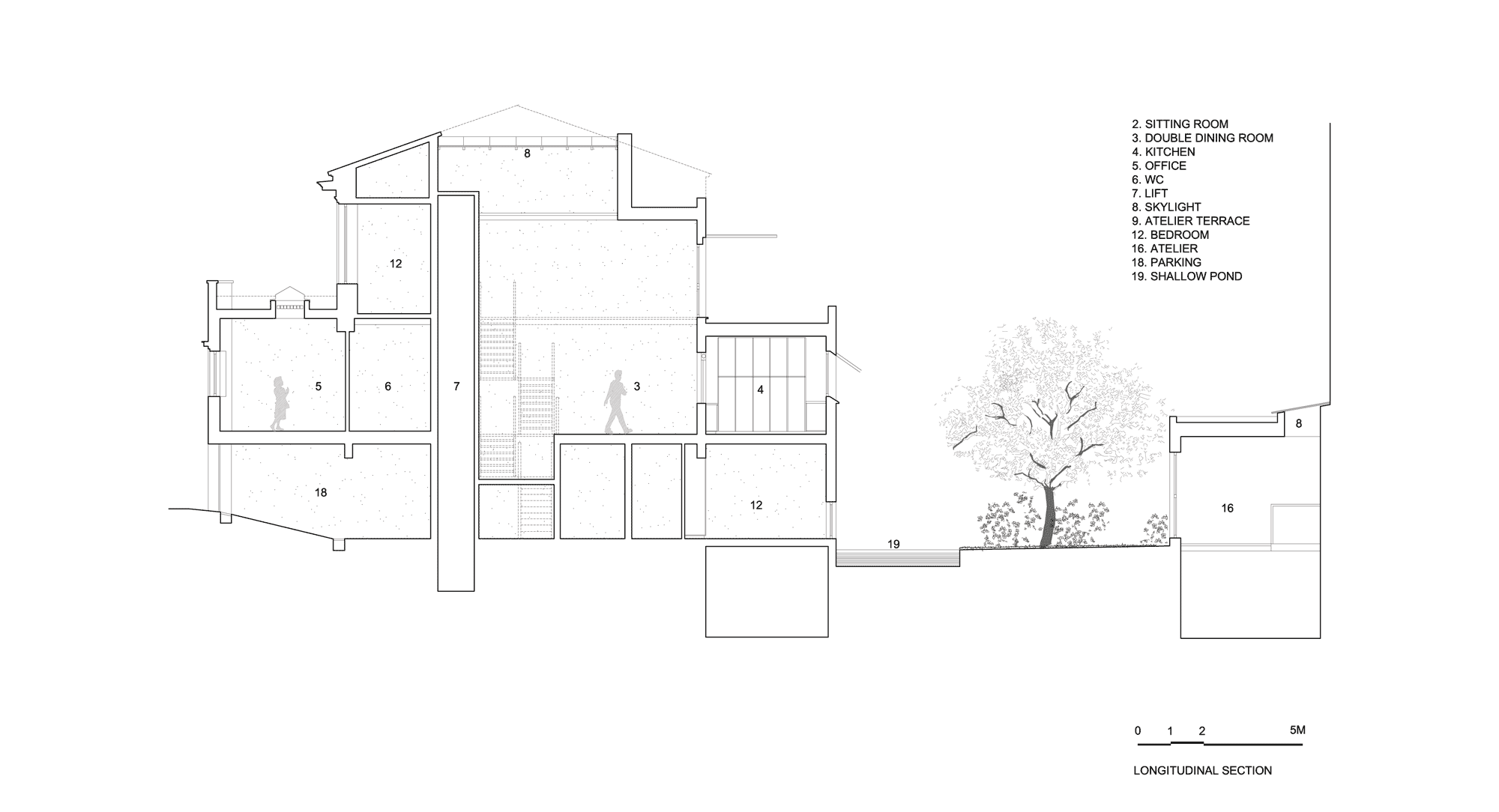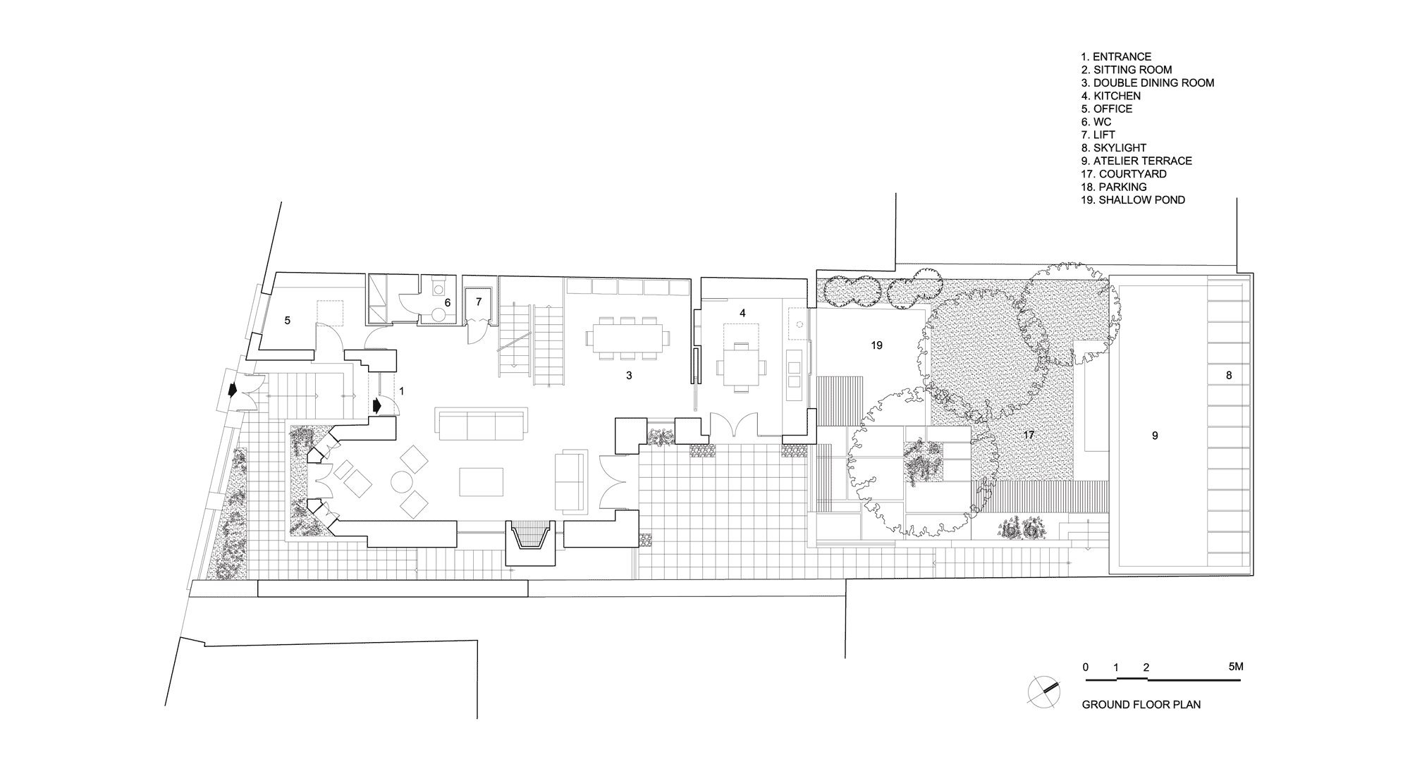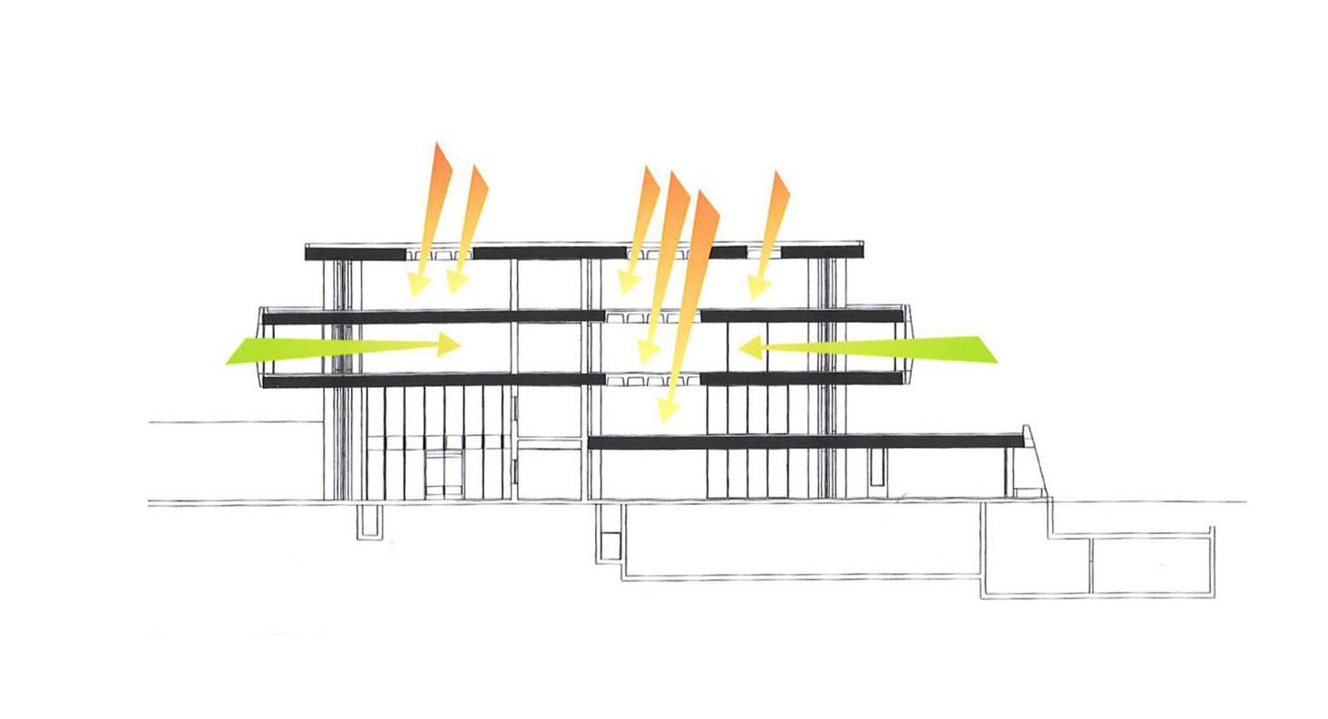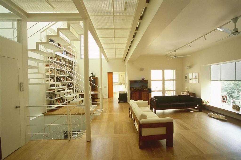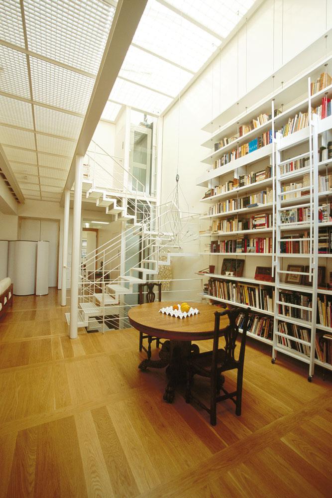 Ιδιαίτερη σημασία δόθηκε εδώ στη διαφάνεια των χώρων και στην εισαγωγή φυσικού φωτισμού. Ο ίδιος ο εσωτερικός χώρος του κυρίου κτίσματος αναπτύσσεται ενιαία τριώροφος. Μια μεταλλική σκάλα και ένας εξώστης, των οποίων τα πατήματα και το δάπεδο αποτελούνται από μεταλλικό πλέγμα, διαπερνούν τον χώρο που δέχεται άπλετο φυσικό φως από τον φεγγίτη του δώματος. Παρόμοιο άνοιγμα οροφής και υαλόφρακτο πάτωμα υπάρχει και στην προσθήκη του atelier, στο πίσω μέρος της αυλής. Γενικά η εισαγωγή του φυσικού φωτός και το παιχνίδισμα των σκιών, που δημιουργούνται από τις διάτρητες μεταλλικές κατασκευές, αποτελούν σημαντικά στοιχεία αυτής της αρχιτεκτονικής σύνθεσης, δείχνοντας τον δρόμο για έναν άνετο και ανθρώπινο τρόπο ζωής στην καρδιά ενός τόσο στενού και ασφυκτικού πολεοδομικού ιστού.