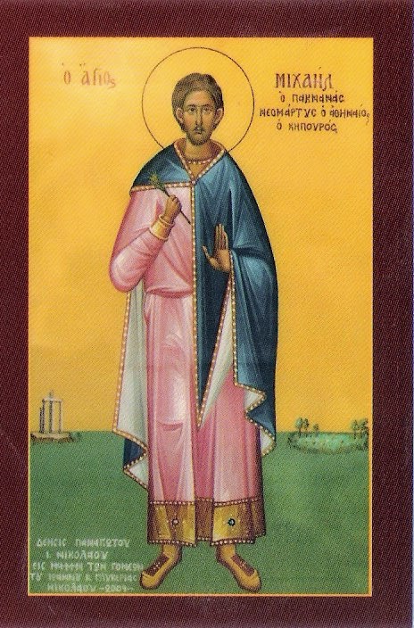 Νεότητι σώματος τὸν παλαμναῖον ἐχθρόν, ἀθλήσας κατέβαλες, ὑπὲρ Χριστοῦ τοῦ Θεοῦ, τμηθεὶς τὸν αὐχένα σου· ὅθεν τῶν Ἀθηναίων ἡ περίδοξος πόλις μέλπει τὴν ἄθλησίν σου, Μιχαὴλ Νεομάρτυς· ἐκ ταύτης γὰρ ὡς ἄνθος εὐῶδες ἐβλάστησας.