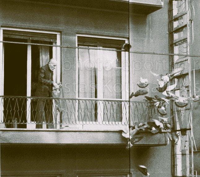 Ταΐζοντας τα περιστέρια στο μπαλκόνι του